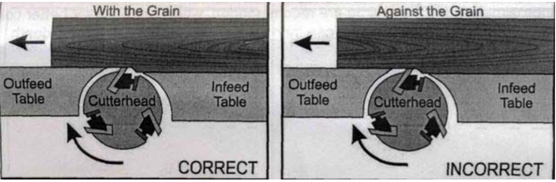 - Be sure to use a proper stance while cutting. A proper stance is one that places the operator to the left of the stock (in case of kickback) and allows the operator total control of feeding the stock through the machine. The operator should use the left hand to hold the stock against the fence and down onto the table. The operator’s right hand feeds the material into the blade at a speed appropriate for the cut- not too fast, not too slow.